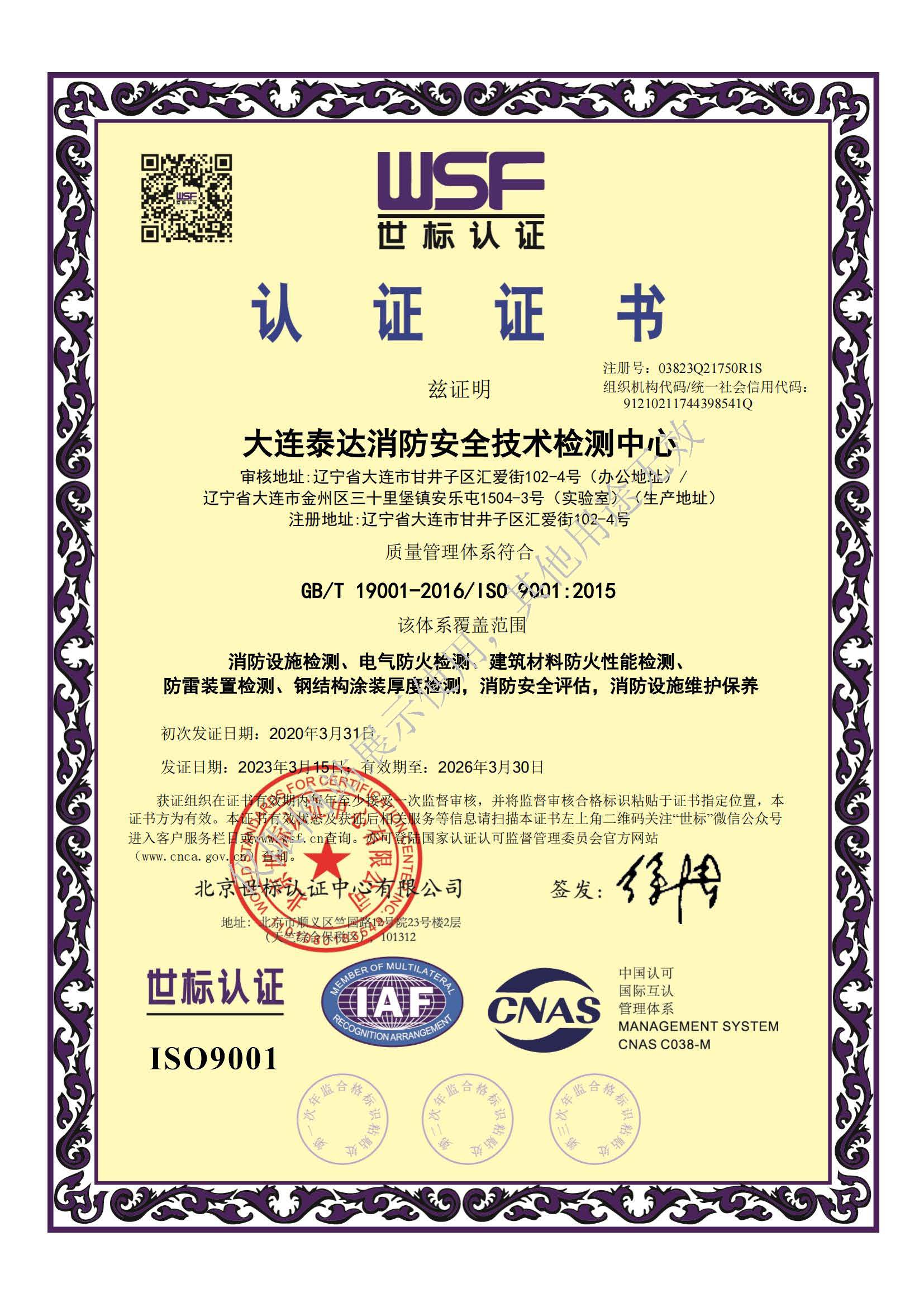 · 是經(jīng)“社會消防技術(shù)服務(wù)信息系統(tǒng)”備案并公示的消防技術(shù)服務(wù)機(jī)構(gòu),已取得中國氣象局頒發(fā)的雷電防護(hù)裝置檢測資質(zhì)證書、遼寧省質(zhì)量技術(shù)監(jiān)督局審核批準(zhǔn)的檢驗(yàn)檢測機(jī)構(gòu)資質(zhì)認(rèn)定證書(CMA)及包括消防檢測、電氣檢測、雷電防護(hù)裝置檢測、防火涂層厚度檢測等在內(nèi)的200余項(xiàng)檢驗(yàn)檢測能力,取得大連市應(yīng)急管理局頒發(fā)的安全生產(chǎn)標(biāo)準(zhǔn)化證書,獲得質(zhì)量管理體系、環(huán)境管理體系、職業(yè)健康安全管理體系認(rèn)證證書,是經(jīng)備案的高新技術(shù)企業(yè),可獨(dú)立出具具有證明作用的檢測報告。